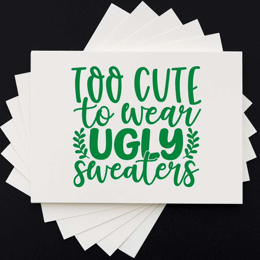 Meet the bold “Too Cute to Wear Ugly Sweaters” design in thick block letters paired with flowing cursive, accented by leafy flourishes for a festive, whimsical vibe.