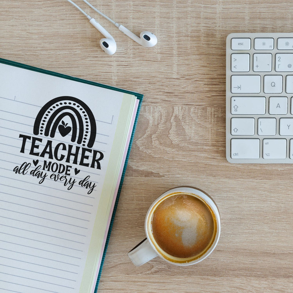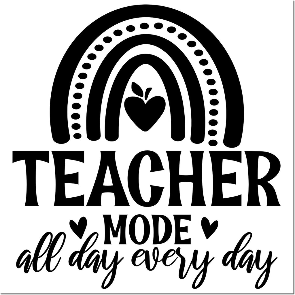 Legendary bold black-and-white design features a rainbow arch made of solid and dotted lines with a heart at its center, delivering standout visuals. Lead with the word “TEACHER” in large, block letters and the playful “MODE all day every day” phrase in mixed fonts with tiny hearts.
