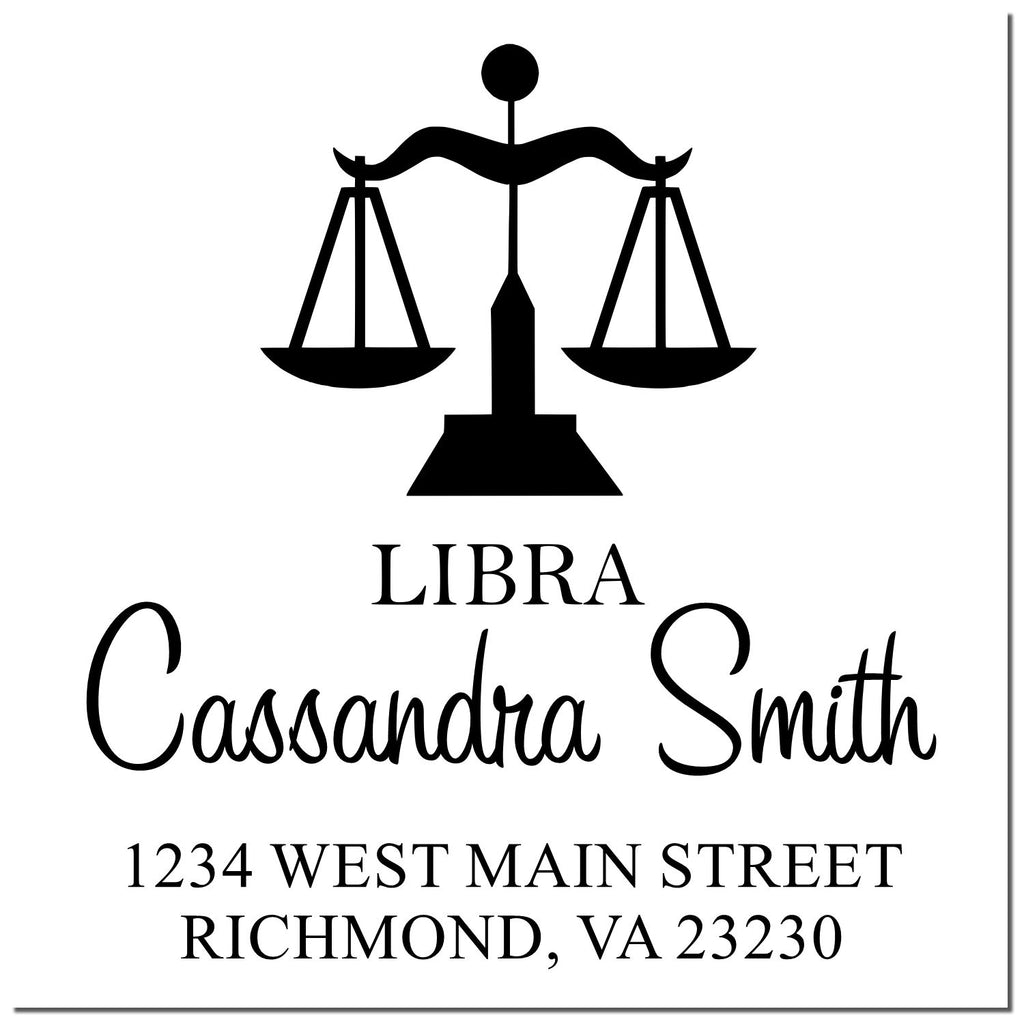 - • ZODIAC INSPIRED ELEGANCE: Beautiful Libra symbol and script font combine with your custom details for a uniquely personalized stamp that reflects your astrological identity.