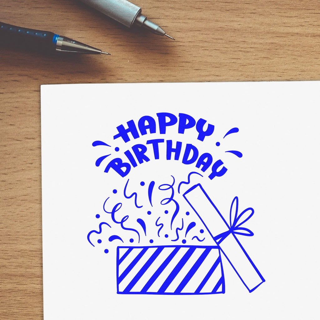 - Design: Black‑and‑white line art shows a striped gift box popping confetti and curling streamers with “HAPPY BIRTHDAY” arched above: instantly recognizable, endlessly festive.