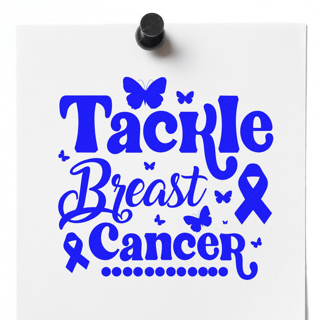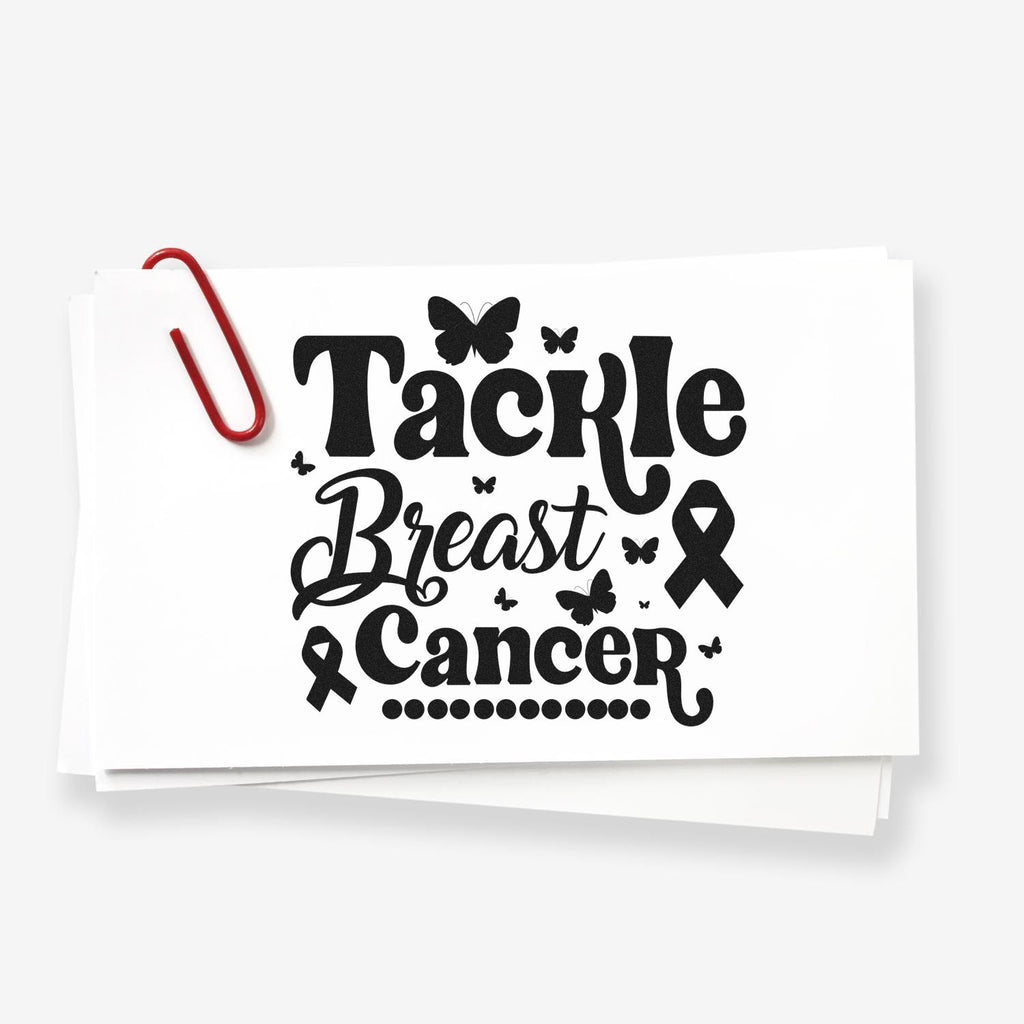 Stunning bold lettering shouts “Tackle Breast Cancer,” while ribbon icons and fluttering butterflies spread hope and solidarity across every project.