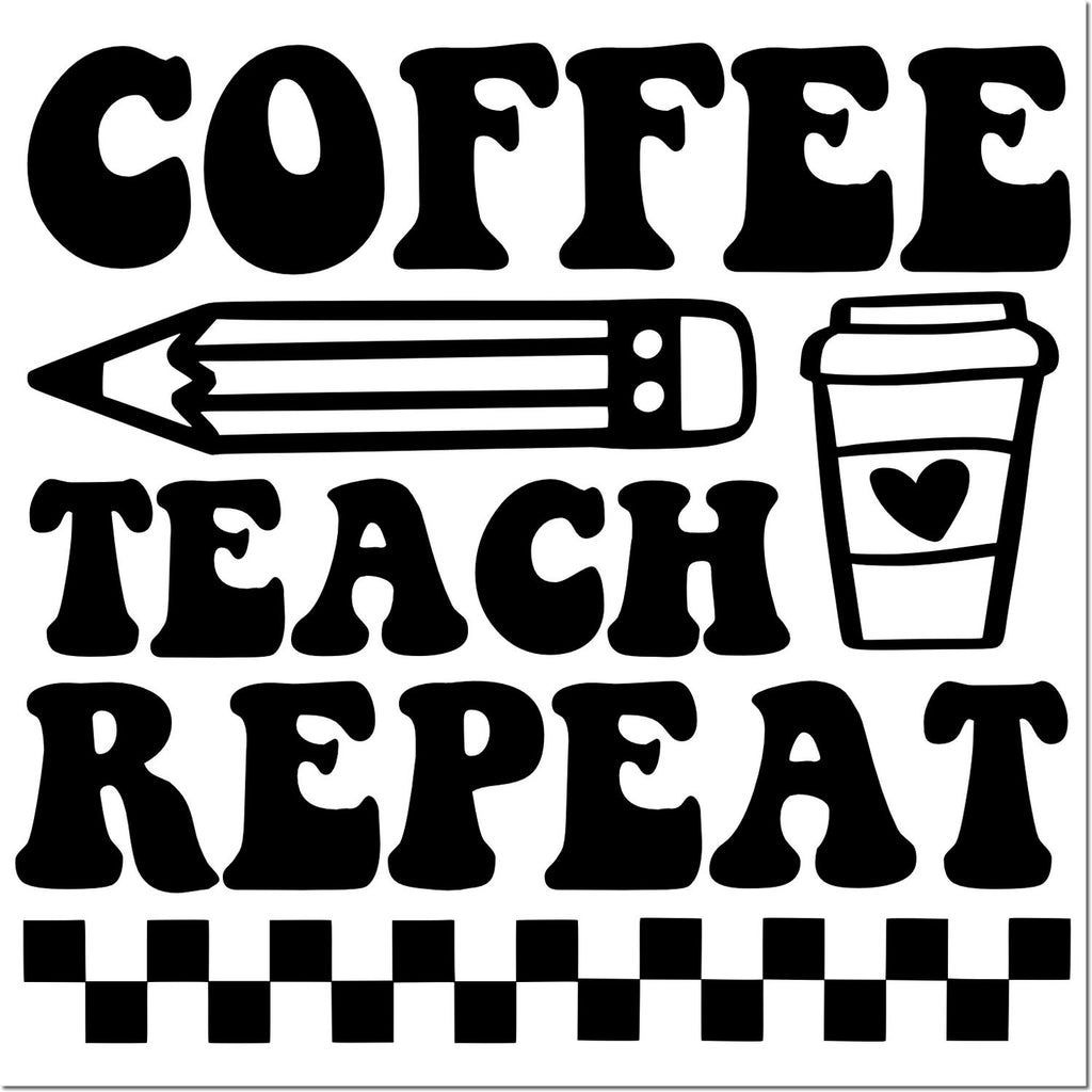 Boldly celebrate progress with a versatile 1-5/8 square stamp that stamps not just work and behavior notes, but envelopes, party favors, and decor—making each student feel special. Brighten every surface with a bold black-on-white design featuring COFFEE, TEACH, REPEAT—complete with a stylized pencil and heart-emblem coffee cup, plus a row of partner squares along the bottom.