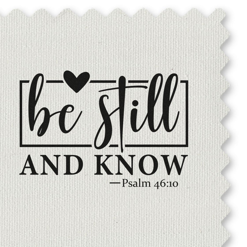 A bold script spells out “be still” framed by a simple rectangle topped with a heart, while “AND KNOW” and “—Psalm 46:10” echo timeless scripture in a modern black-and-white design.
