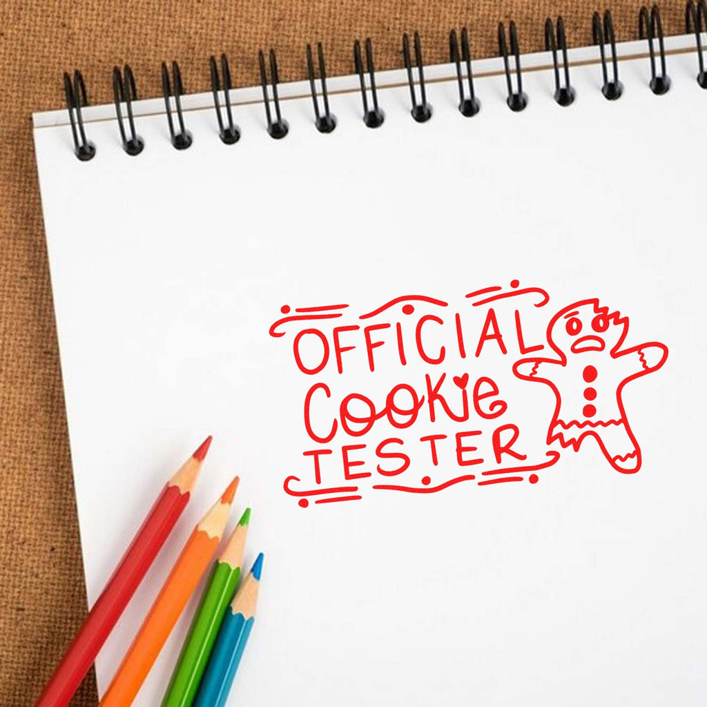 - Distinctive: Playful hand-drawn “OFFICIAL COOKIE TESTER” lettering with decorative swirls and a surprised bite-mark gingerbread adds charm that boosts perceived value and shareability.