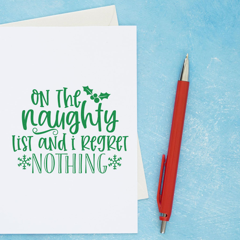 - Playful: Bold typographic layout reads “On the naughty list and I regret nothing” framed by holly and snowflakes: perfect for cheeky layouts and laugh-out-loud cards.