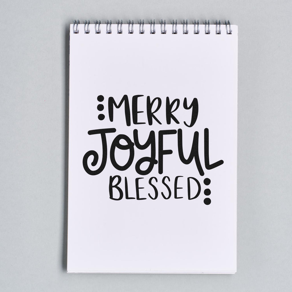 - Creative: Black hand-lettering style (MERRY top, JOYFUL center flourish, BLESSED base with dot accents) adds playful, polished charm to every holiday piece.