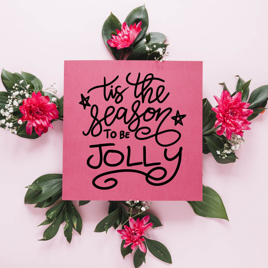 Embrace the 1-5/8 square design and the festive hand-lettered “’tis the season to be jolly” motif, enhanced by swirling flourishes and cheerful star accents on a clean white backdrop.