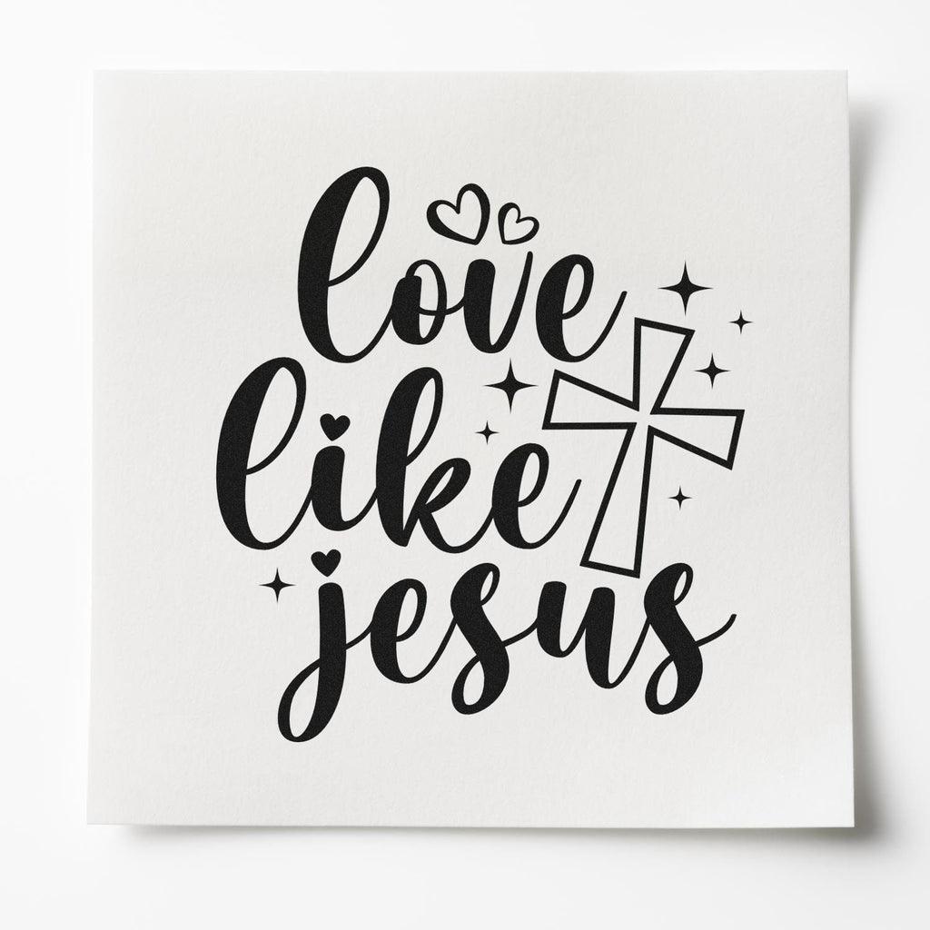 Shaped callouts: the image features bold black cursive “love like Jesus” with a white backdrop, surrounded by tiny hearts and star-like sparkles for a clean, inspirational vibe. One simple outlined cross anchors the motif for timeless impact.