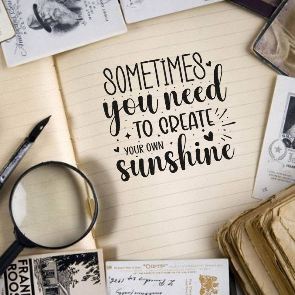 Pictorial hand-lettering and bold print are showcased by the image-anchored quote “Sometimes you need to create your own sunshine,” delivering motivational impact on cards, tags, and envelopes.