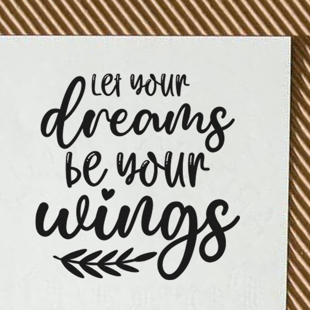 - Personalize: Add the hand-lettered “Let your dreams be your wings” quote with the cute heart-dot and leafy accent to instantly match invitations and table decor for a cohesive, memorable look.