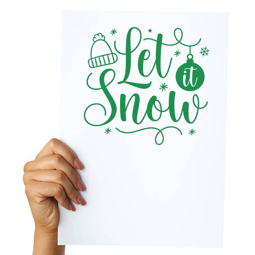 Before: you’re juggling last-minute orders and DIY decorations that don’t match. After: a bold, joyful “Let it Snow” surrounded by a pom-pom hat, sparkling snowflakes, and a dangling ornament—your signature winter look in an instant.