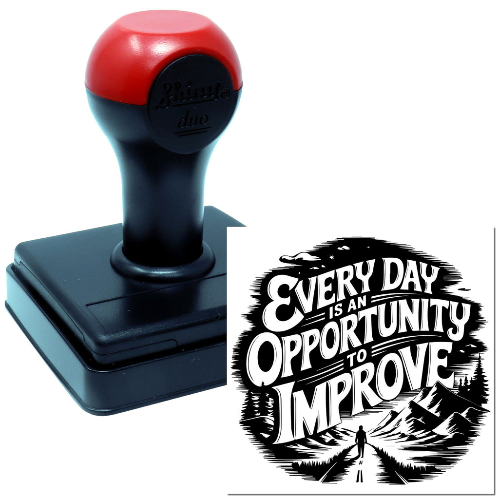 Level up every day with the Duo Every Day Opportunity To Improve Hand Stamp—a compact, reusable bullet journal stamp and teacher feedback stamp that turns “I’ll try” into “I did.” If your reflections, goals, or student notes get lost in the shuffle, this stamp makes improvement visible and actionable. The playful, sunrise-style lettering and a lone adventurer heading toward mountain peaks create a motivating scene that nudges growth without nagging. Problem solved: clear, consistent cues that invite progress—fast.