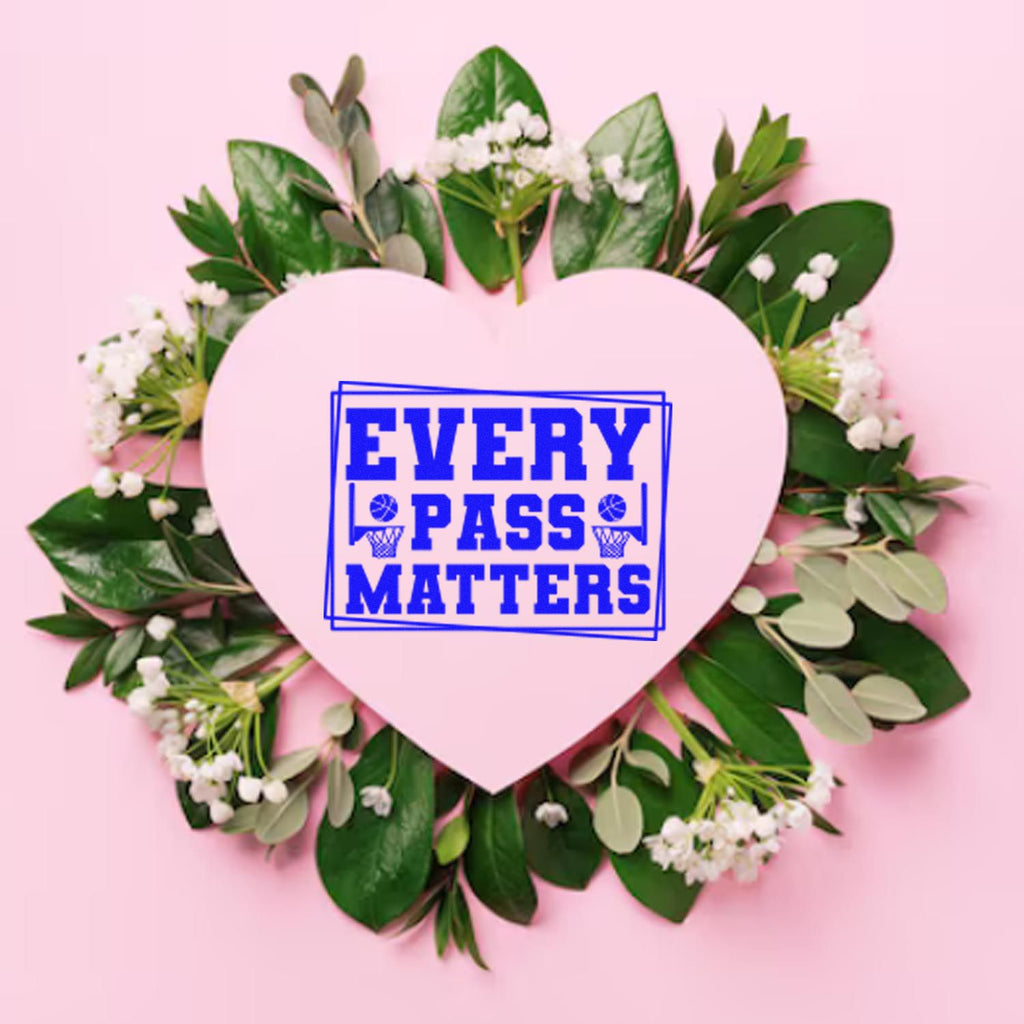 Design that motivates: bright varsity letters shout “EVERY PASS MATTERS” inside tilted frames, with bouncing basketballs into hoops on each side—bold black-and-white energy that feels like a locker-room rally and celebrates every assist.