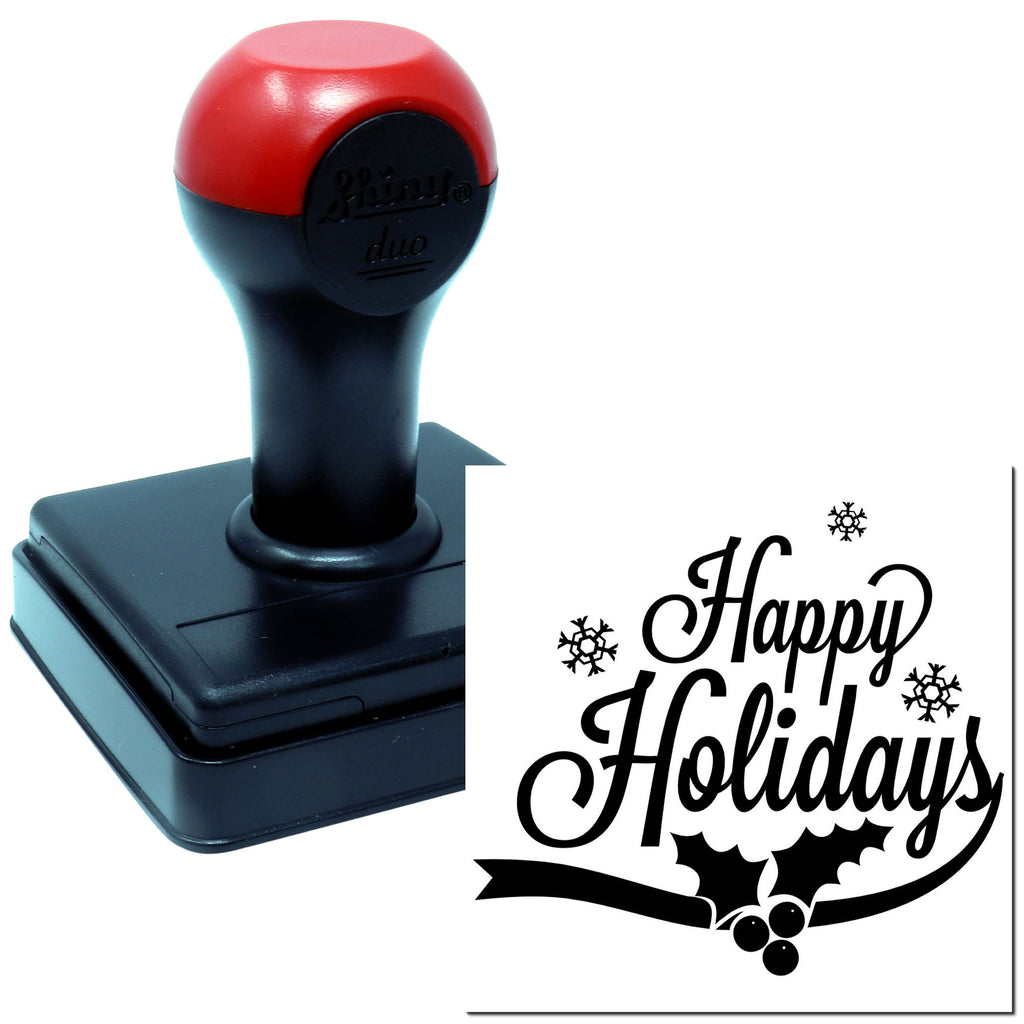 Meet the Duo Festive Holly Snowflakes Holiday Greeting Hand Stamp, powered by the Shiny Duo for speed and durability. The snap-apart body swaps parts in seconds, the snug dust shield keeps your laser-etched die pristine, and the comfort grip resists fungal growth for worry-free marathon sessions. A cheerful black-and-white backdrop features “Happy Holidays” in playful, swirling script sprinkled with tiny snowflakes, while a curling holly sprig with three berries and a festive ribbon ties your look together—all in a crisp 1-5/8" square impression. Compatible with a variety of inks for flawless performance. Ink pad sold separately.