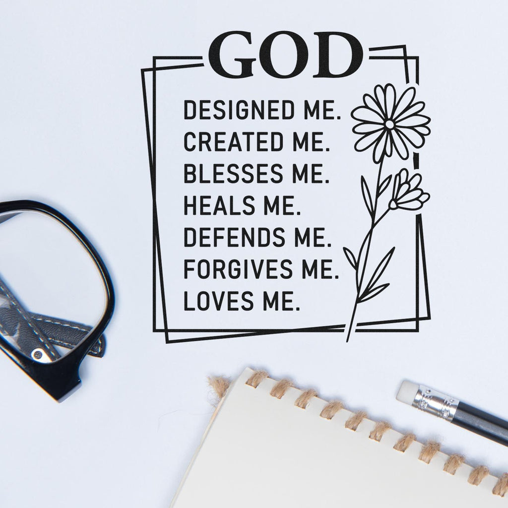 Design they’ll remember: a vibrant “GOD” at the top with affirmations—crafted me, created me, blesses me, heals me, defends me, forgives me, loves me—surrounded by playful overlapping lines and a sweet hand-drawn daisy for a hopeful, minimalist vibe.