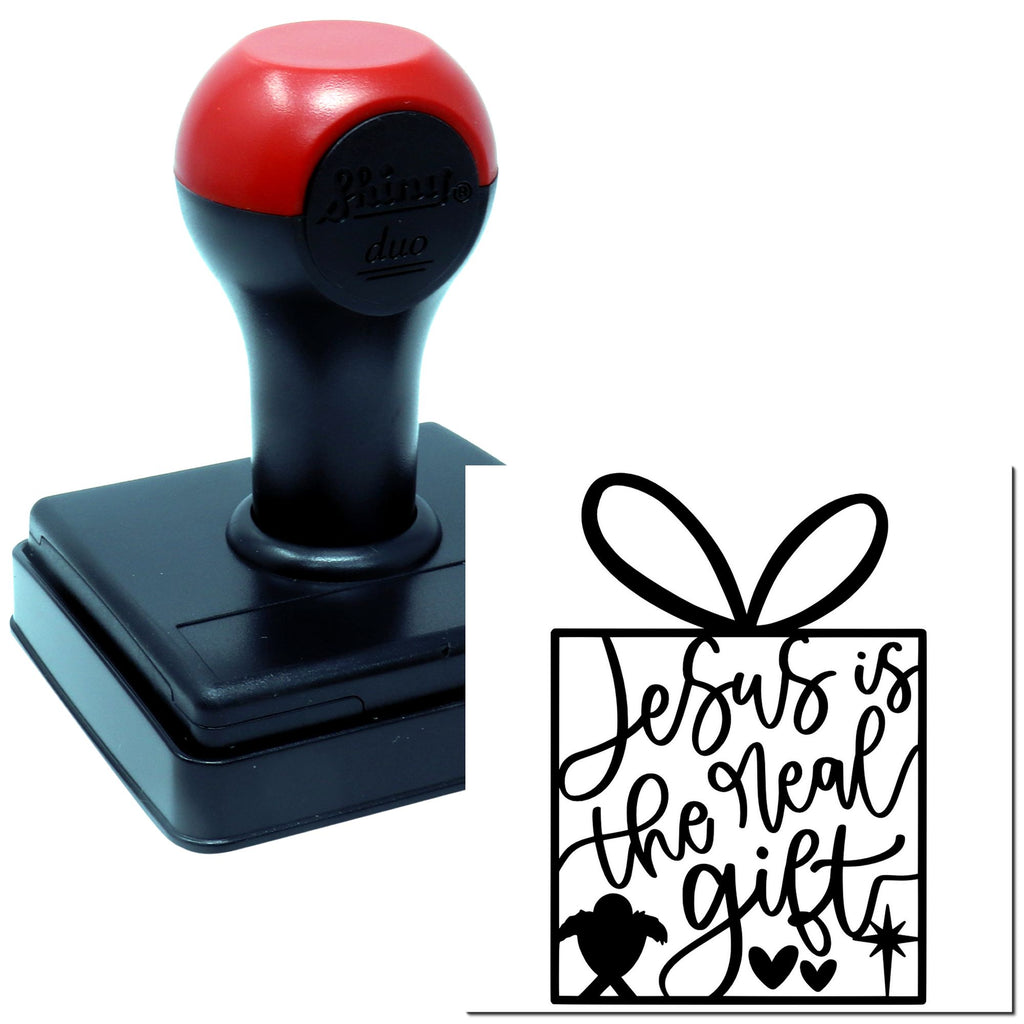 Freshen up lessons and crafts with the Duo Jesus Is The Real Gift Hand Stamp — a 1-5/8" square, hand-lettered design featuring a bow, tiny nativity, hearts, and a shining star proclaiming "Jesus is the real gift."