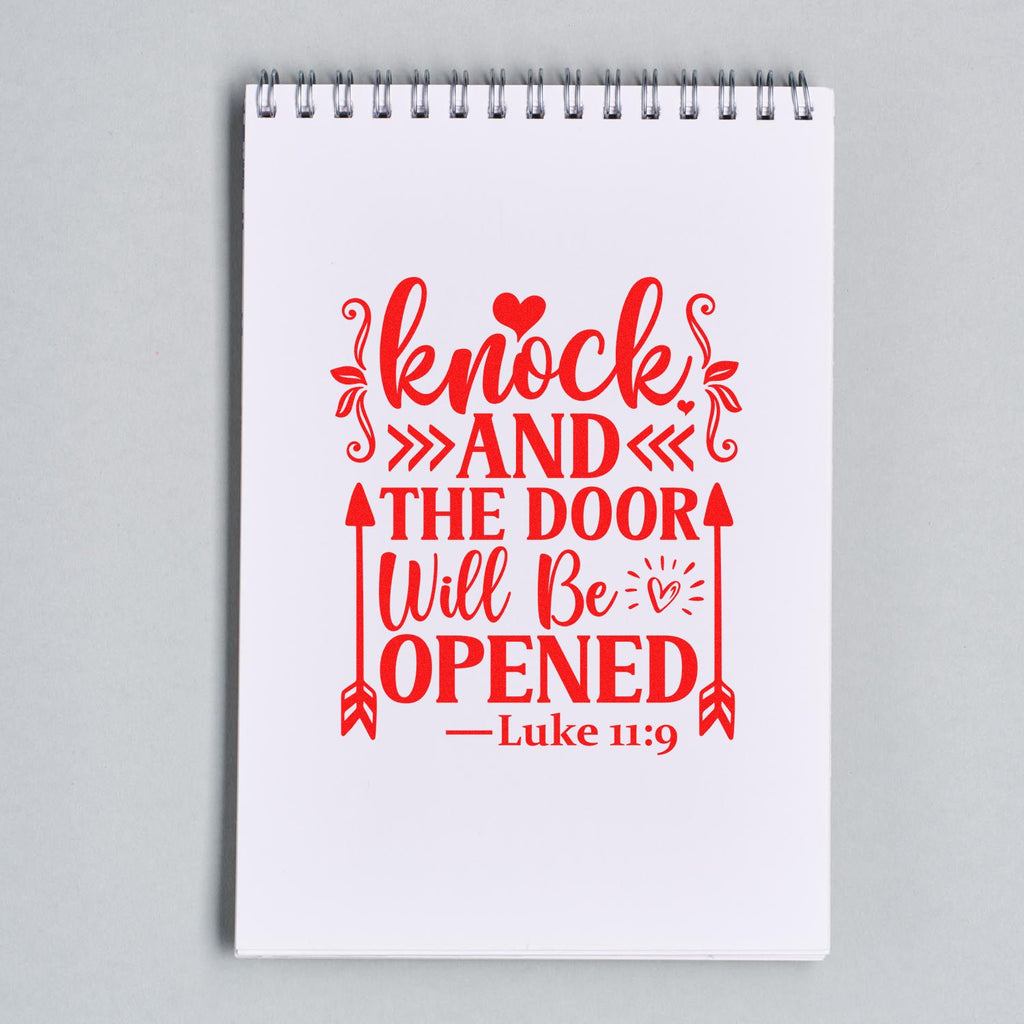 Design that speaks: a lively hand-lettered sign with arrows and tiny hearts inviting a hopeful knock, crowned with “Luke 11:9,” to nudge learners toward new adventures and reflections.