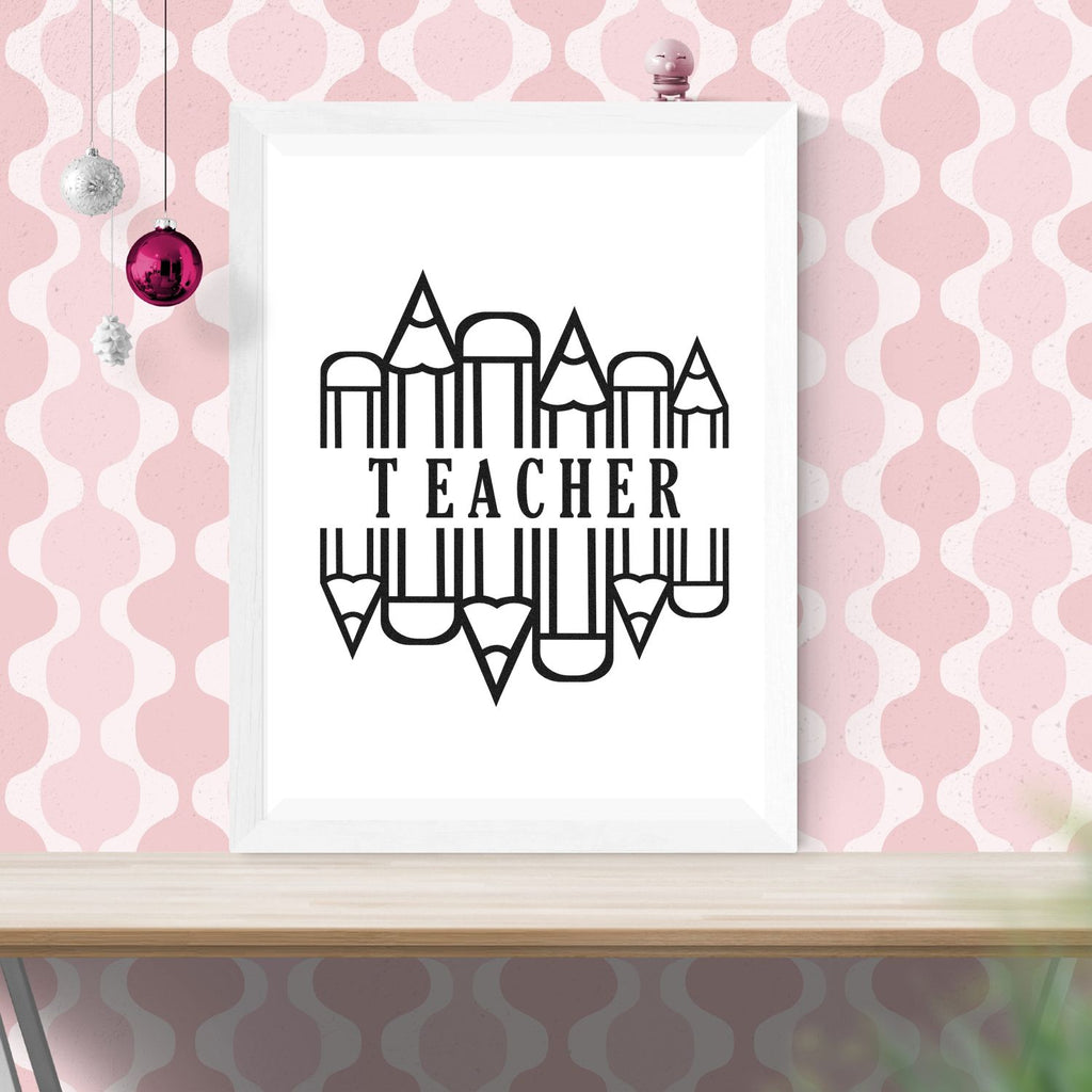 Before: blank envelopes, plain behavior charts, and forgettable gift tags. After: a mirrored skyline of pencils and erasers framing a bold TEACHER—an eye-catching, timeless black-and-white look students adore and teachers treasure.