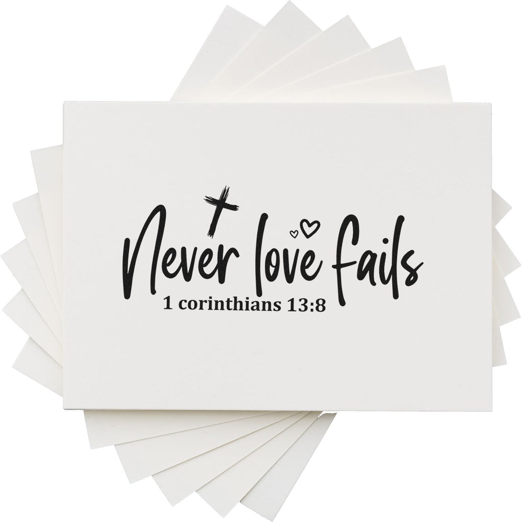 Design that speaks: a painted cross with two tiny hearts and the cheerful handwritten message “Never love fails,” inspired by 1 Corinthians 13:8—perfect for Bible journaling, encouragement cards, and theme-based outreach crafts.