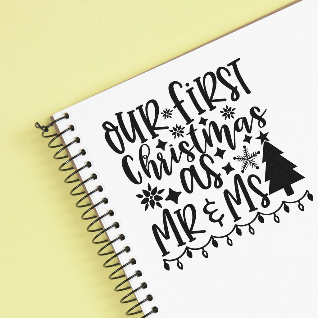 Designed with cheerful hand-lettering that reads “Our first Christmas as Mr & Mrs,” accented with stars, poinsettias, a snowflake, a festive fir, and twinkling bulbs, it’s a joyful celebration for newlyweds—or the perfect gift from friends and family.