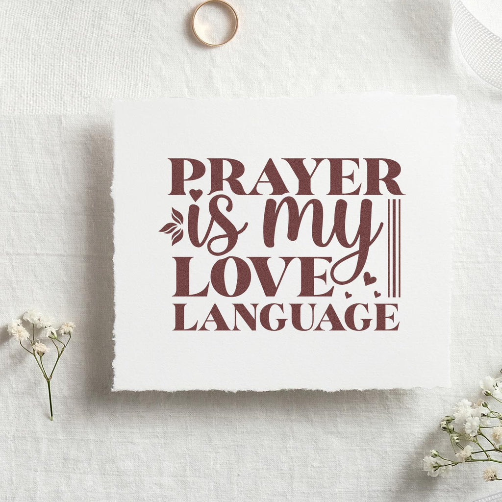 Before: you’re rushing to prep reward cards and memory verse tags, juggling supplies and hoping the stamp looks clear. After: snap the Duo together, press once, and reveal crisp, joyful art that reads “Prayer is my love language” in bright black lettering—fancy serif meets swoopy script, dotted with tiny hearts and a leafy sprig. It’s bold on white, elegant and fun, and unmistakably heartfelt.