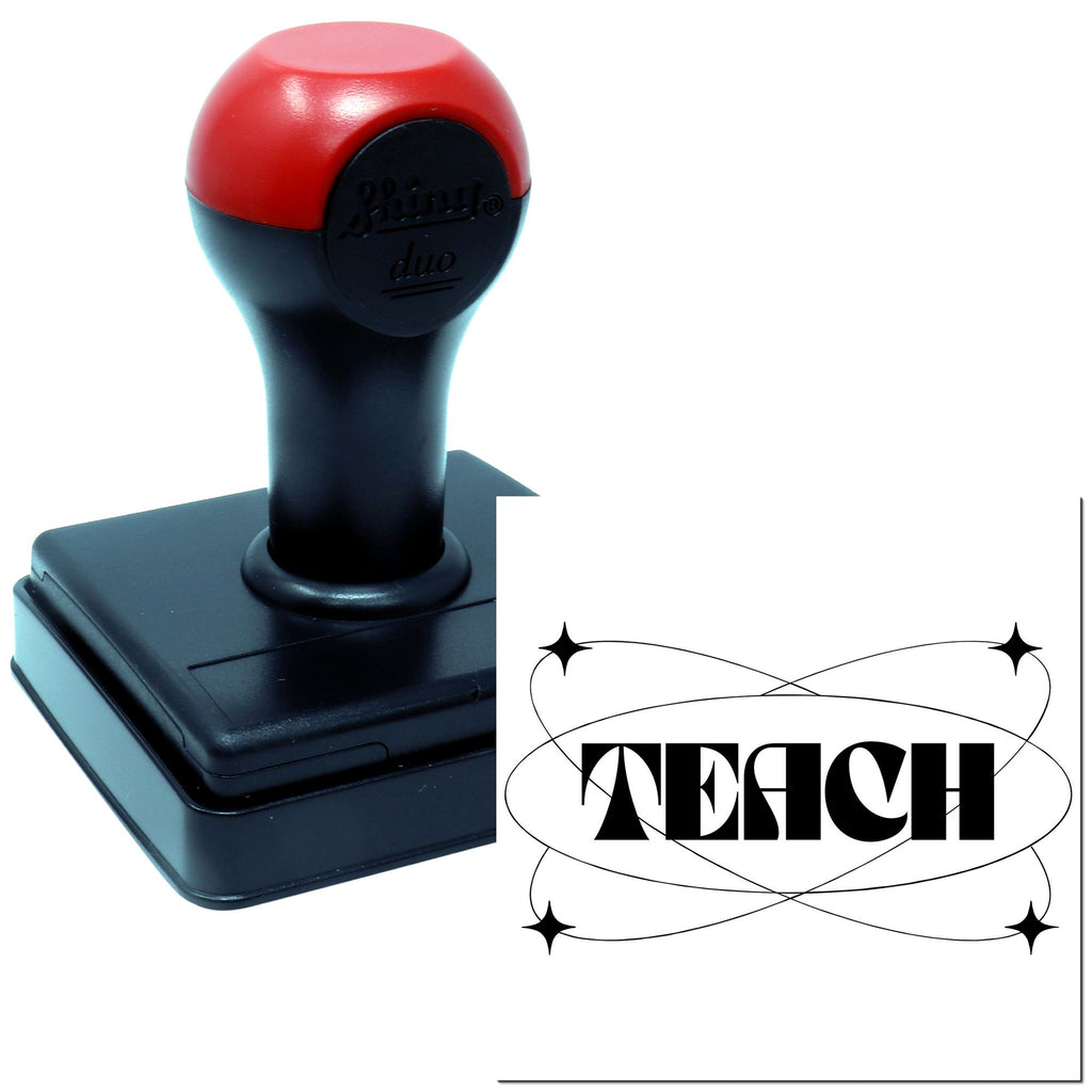 Problem: your classroom labels, rewards, and scrapbook pages feel mismatched and take forever to make. Agitate: sticky notes peel, markers smudge, and your theme never looks quite “put together.” Solve: this 1-5/8" square retro atomic star stamp delivers instant cohesion—one press and your “TEACH” badge pops in chunky Art Deco type, encircled by elliptical orbits and four sparkling starbursts for true mid-century charm.