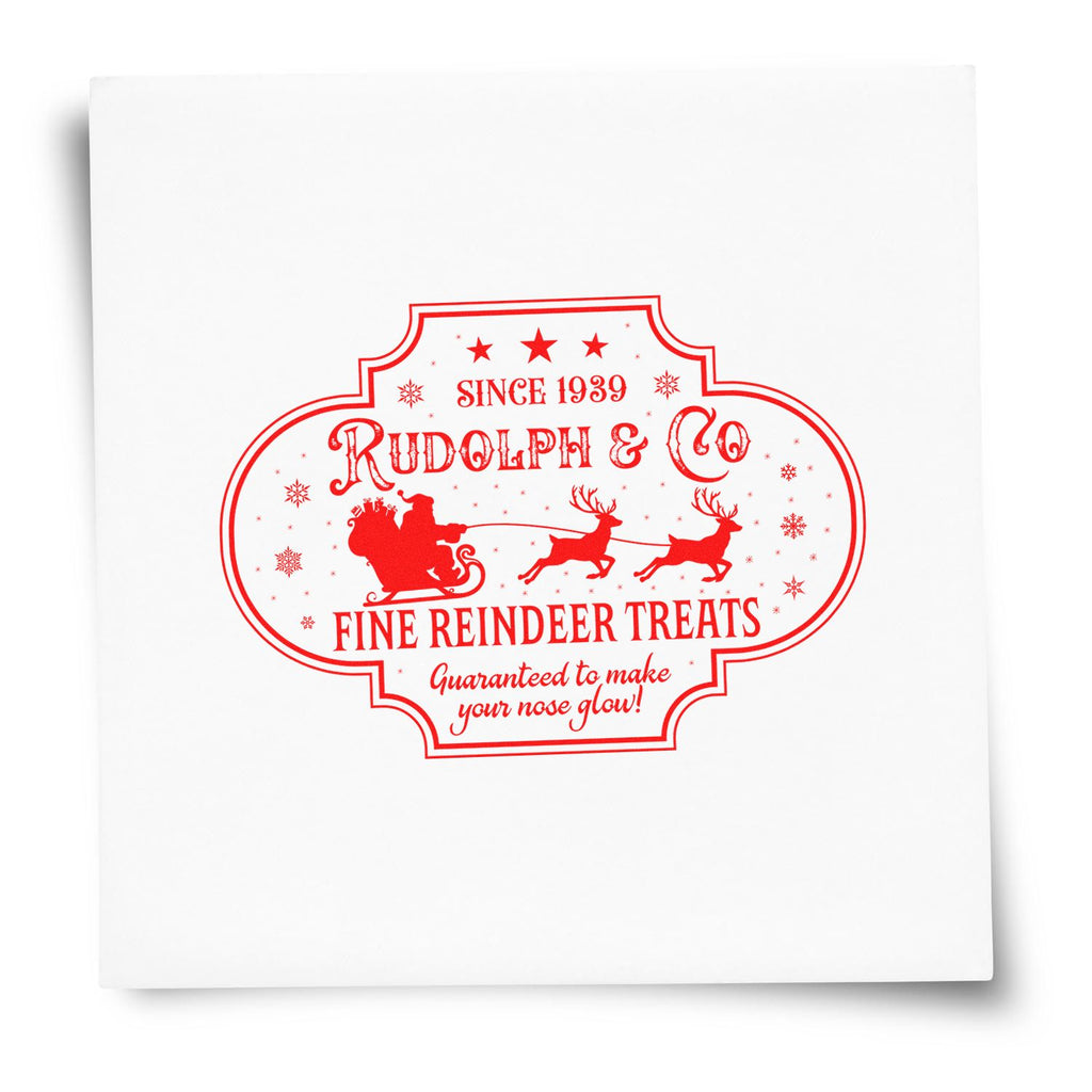 A retro label springs to life: Santa in his sleigh with two lively reindeer, framed by snowflakes and stars, reading “Rudolph & Co” and “Fine Reindeer Treats”—a charming nod that makes noses (and customers) glow with cheer. Size: 1-5/8" square. Ink pad sold separately.