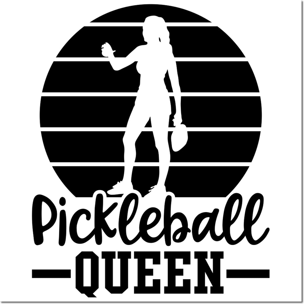 Meet the Duo Sunset Silhouette Pickleball Queen Emblem Hand Stamp: a bold 1-5/8" square mark that declares authority with every impression. A fierce figure with paddle and ball stands beneath a striped sun while fun script and punchy blocks crown her as the ultimate Pickleball Queen.