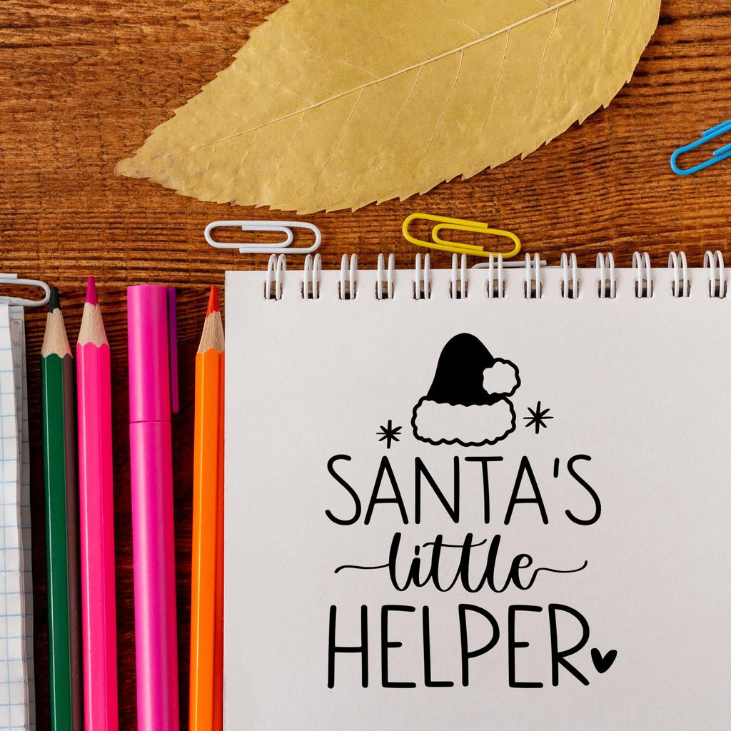Meet the Duo Tiny Festive Santa's Helper Print Hand Stamp, a 1-5/8 Square charmer that leaves a crisp black-and-white “Santa’s little helper” message topped with a tiny hat—equal parts merry and mischievous for instant cheer on crafts, cards, tags, and envelopes.