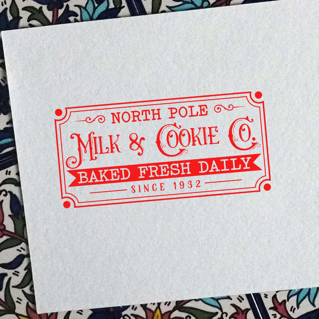 Built to perform: Shiny Duo modular body with snap-on dust cover; comfort handle with anti-fungal protection; precision laser-cut rubber die for use with multiple ink types; 1-5/8" square impression. Retro black-and-white North Pole Milk & Cookie Co. Art with a bold “Fresh Baked Daily” banner brings instant nostalgia. Note: ink pad sold separately.