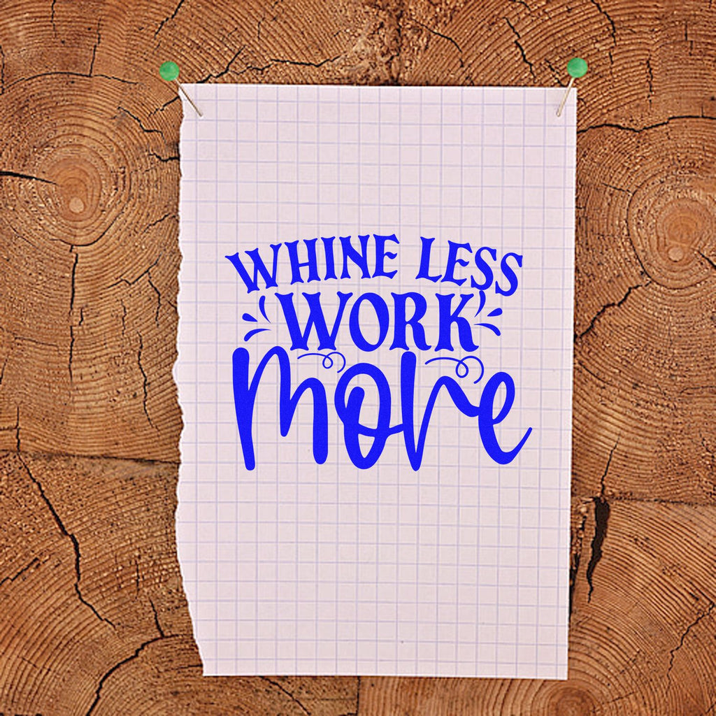 A lively hand‑lettered motto—“Whine Less, Work More”—blends vintage serif caps with breezy script, turning your mark into an energizing nudge to get moving. Format: 1‑5/8 Square for bold visibility without hogging space.