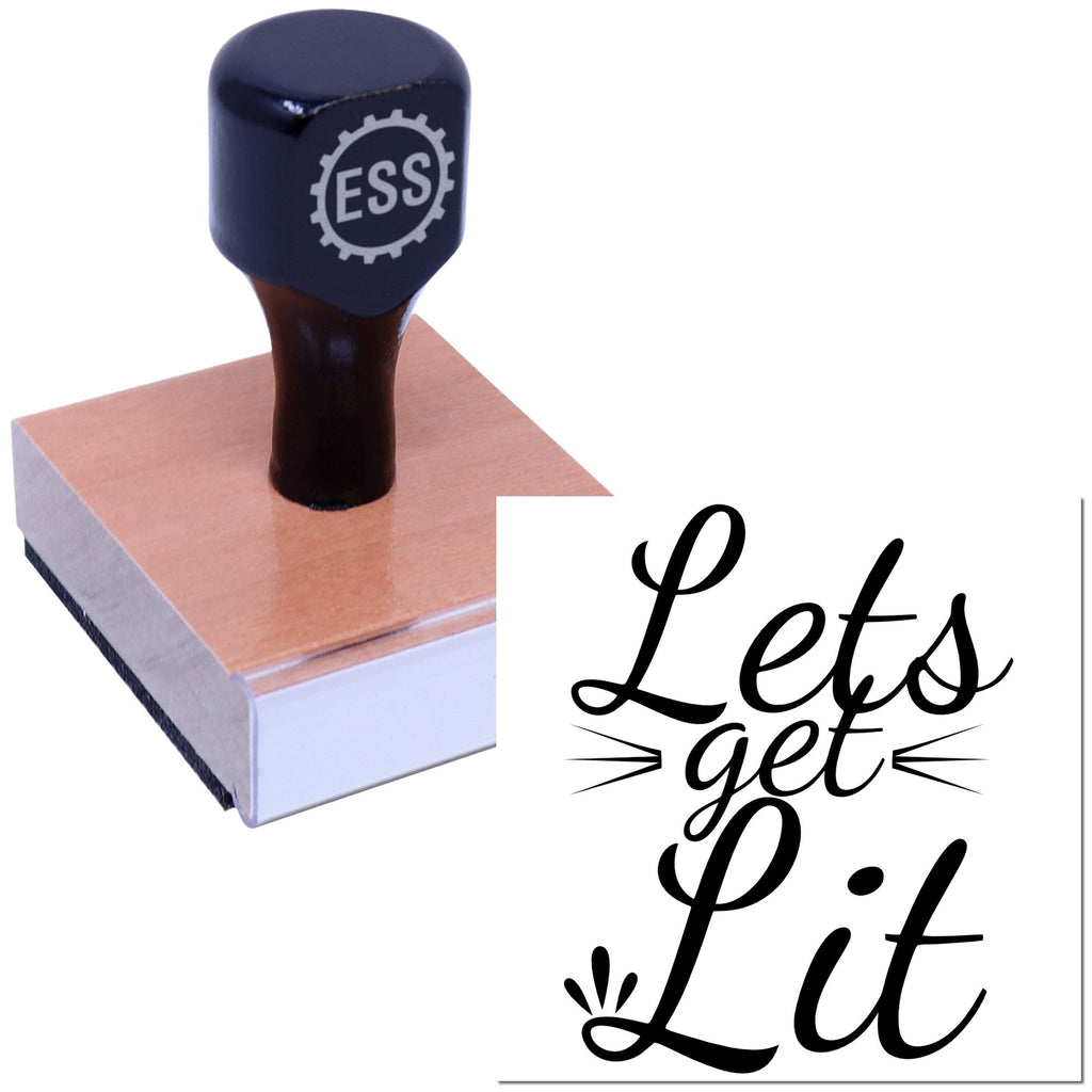 Unleash party energy with the 1-5/8" Dynamic Party Script Paper Goods Rubber Stamp that shouts “Let’s get Lit” in bold black script for invitations, envelopes, and packaging.