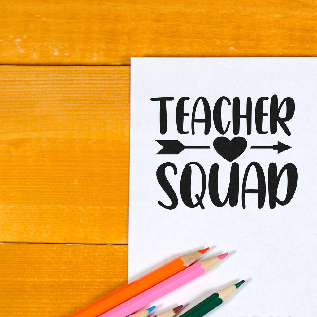 Distinguished by a bold "TEACHER SQUAD" graphic in chunky black text with a solid heart flanked by arrows, the design radiates energy.