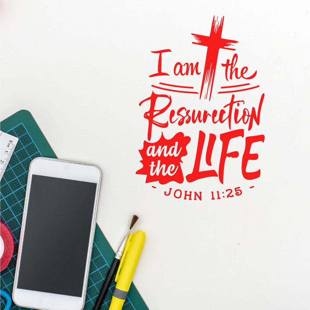 - Precise message: bold hand-lettered cross and brushstroke text proclaim “I am the Resurrection and the Life” with John 11:25 reference, creating reverent, readable focal points every impression.