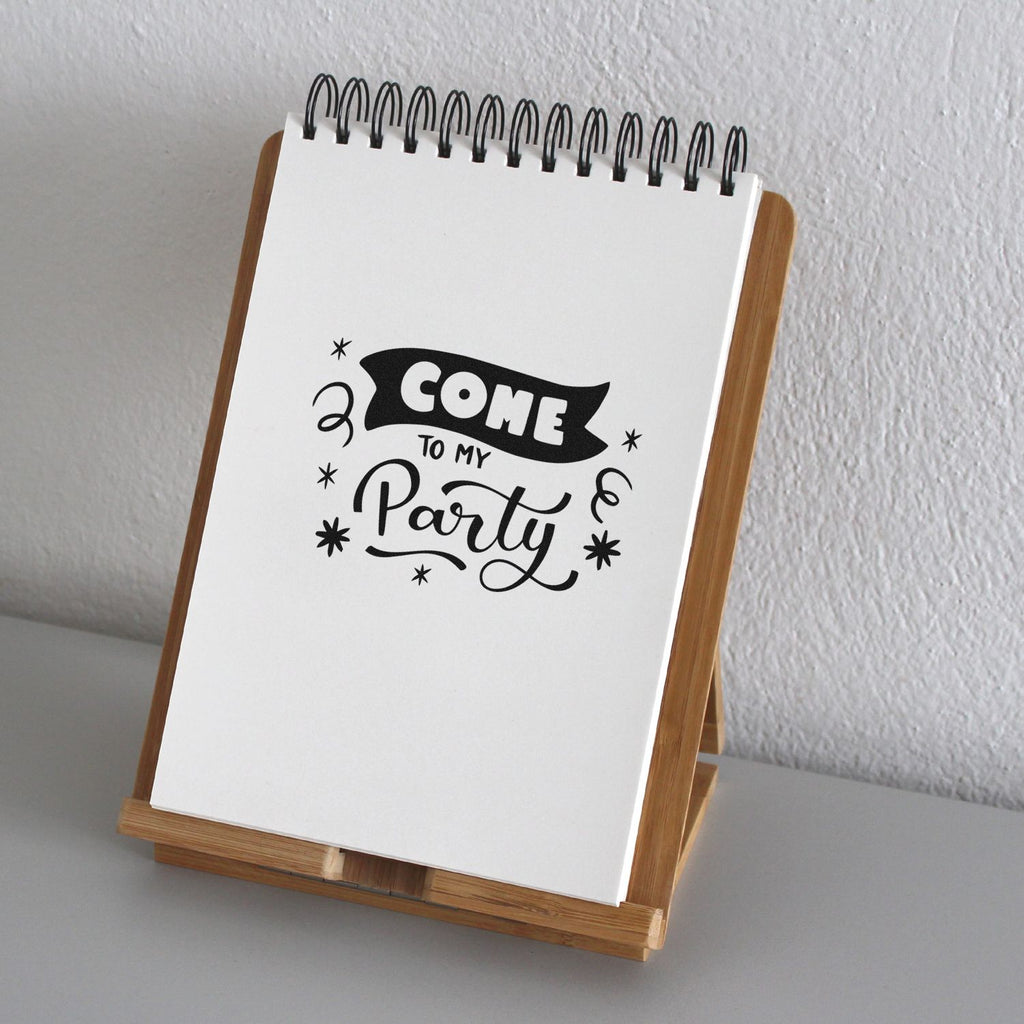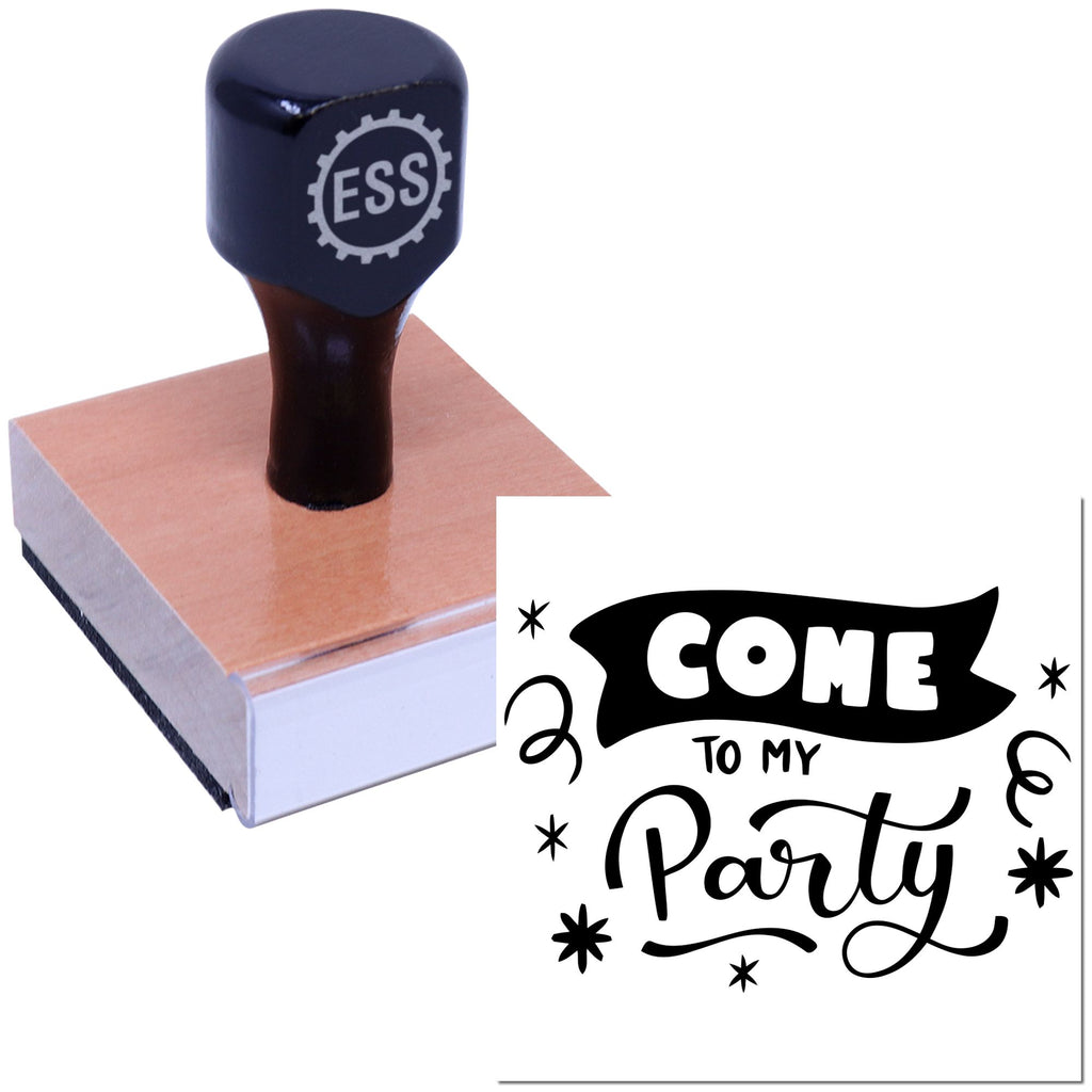 Whether you're mass-producing themed invitations or crafting unique keepsakes, this stamp delivers consistent, beautiful results every time. Its festive design, featuring "COME to my Party" with playful stars, swirls, and flourishes, adds a joyful touch to all your projects. Don't miss out—bring your celebrations to life today!