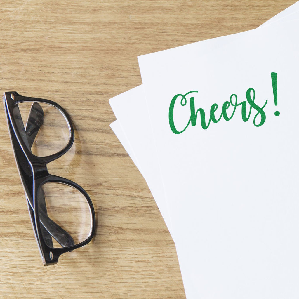 Add professional polish to every project with a flowing black script that spells “Cheers!” in graceful, handwritten-style lettering.