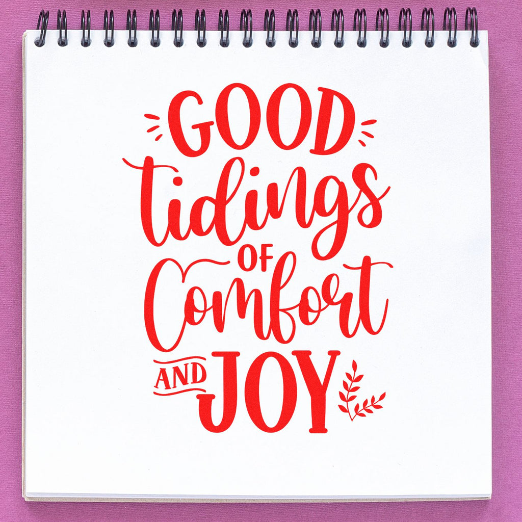 Transform your seasonal projects into eye-catching works of art with its elegant design featuring “Good tidings of comfort and joy” complemented by charming leaf accents. The clean black typography on white background offers a festive, timeless look that stands out on any surface.