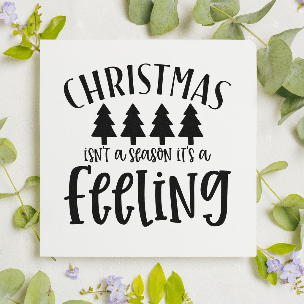 Create crisp impressions every time with laser-engraved precision showing four stylized pine trees above the hand-lettered phrase “Christmas isn’t a season it’s a feeling.”