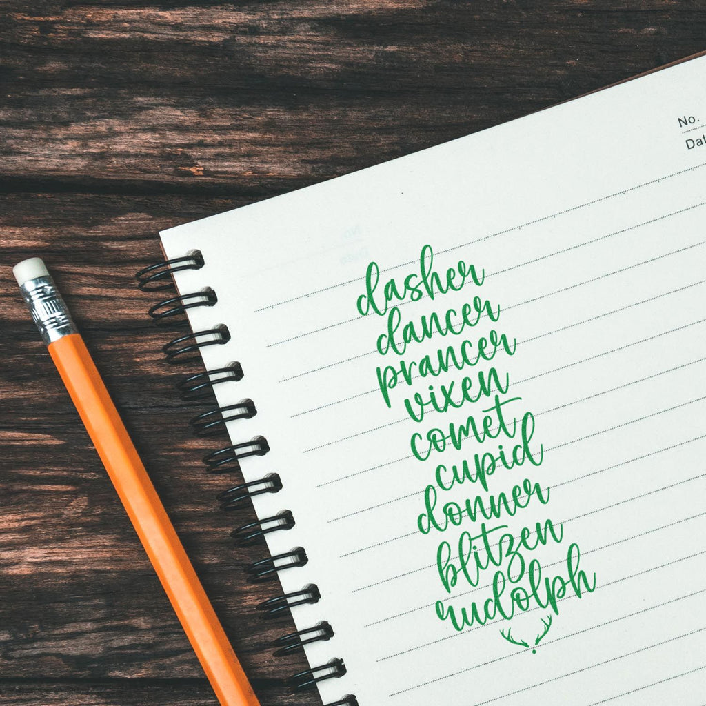 Quintessential laser-engraved rubber dies deliver razor-sharp calligraphy of Dasher, Dancer, Prancer, Vixen, Comet, Cupid, Donner, Blitzen, and Rudolph for crisp, professional impressions every time.