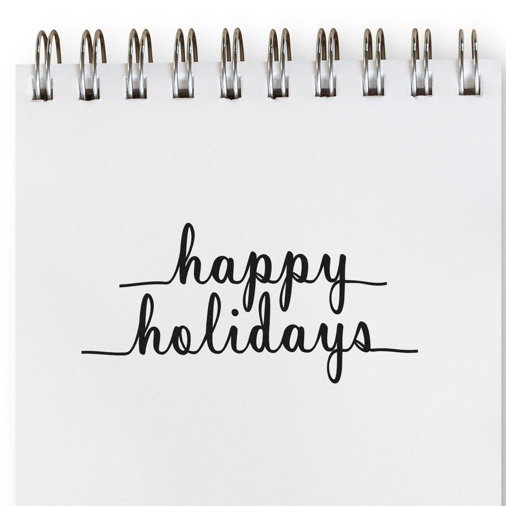 Bright black cursive spells “happy” above matching “holidays” with delicate flourishes for an elegant, handcrafted finish.