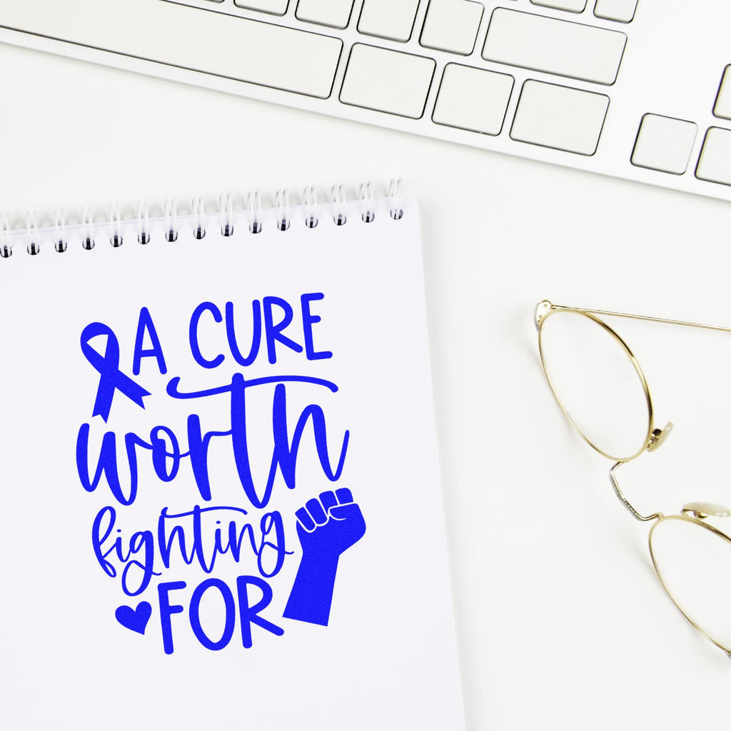 Powerful artwork features “A cure worth fighting for” in bold, black-and-white lettering with an awareness ribbon and fist.