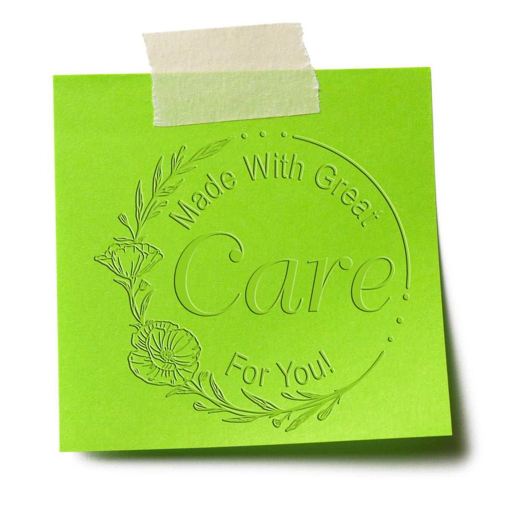 This custom stamp design showcases a chic circular layout adorned with stylish, hand-drawn floral accents. The phrase "Made with Great Care for You!" elegantly curves around the circle's inner edge, with "Care" standing out in a bold, serif font at the center, drawing attention as the focal point. The delicate floral illustrations, featuring graceful flowers and leaves, infuse the design with a natural elegance and sophistication. The overall look is sleek, modern, and visually appealing, perfect for adding a personal and thoughtful touch to a variety of items. Measuring at 1-5/8" round, this embosser is the ideal size for handmade gift tag seals and more.