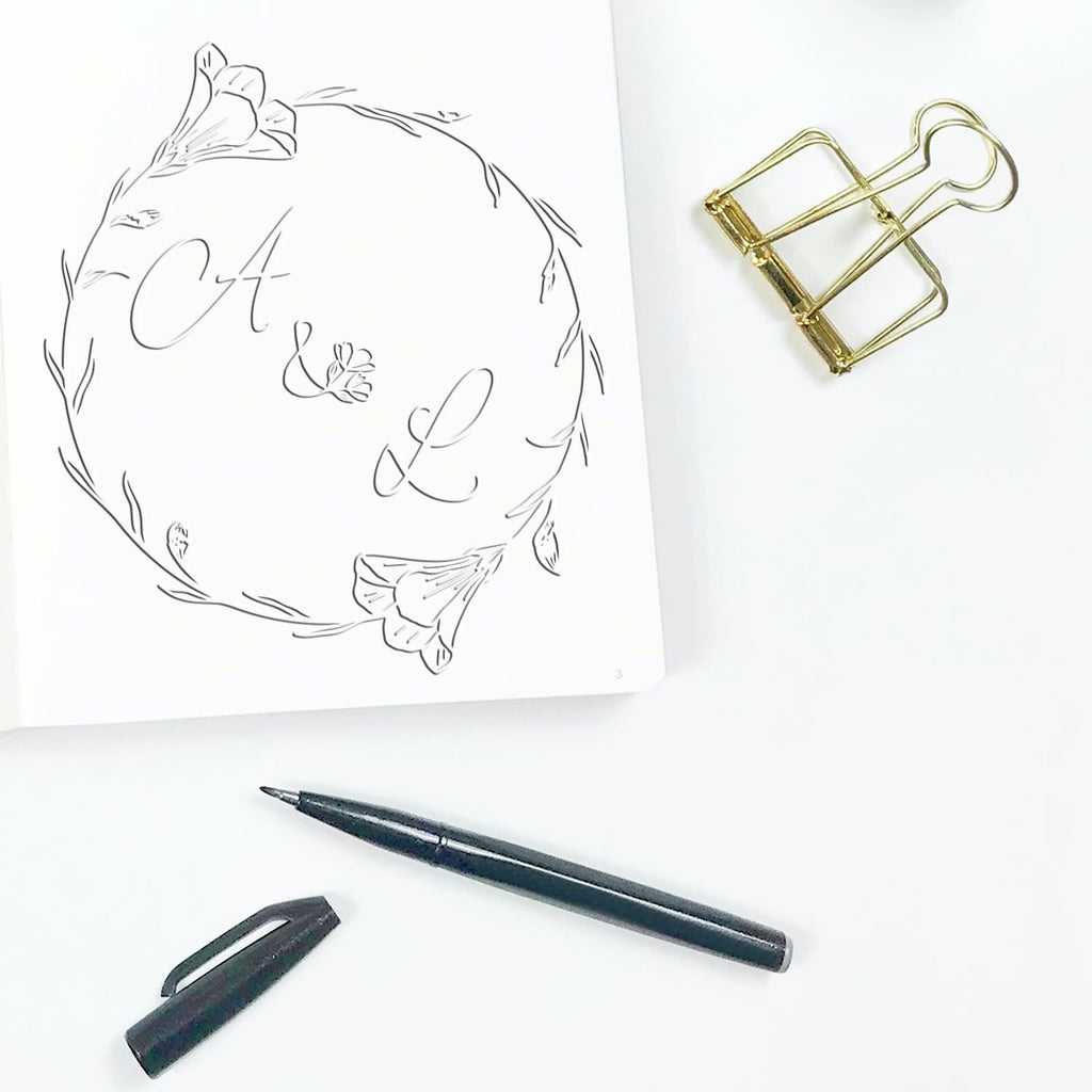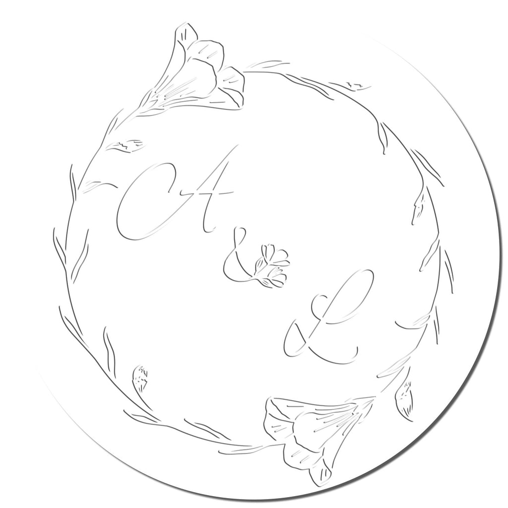 Featuring a stunning circular floral wreath design with delicate hand-drawn blooms, this decorative monogram embosser showcases your intertwined initials in graceful cursive script. The minimalist yet sophisticated design makes every impression a work of art, perfect for wedding invitations, thank you cards, and personal correspondence.