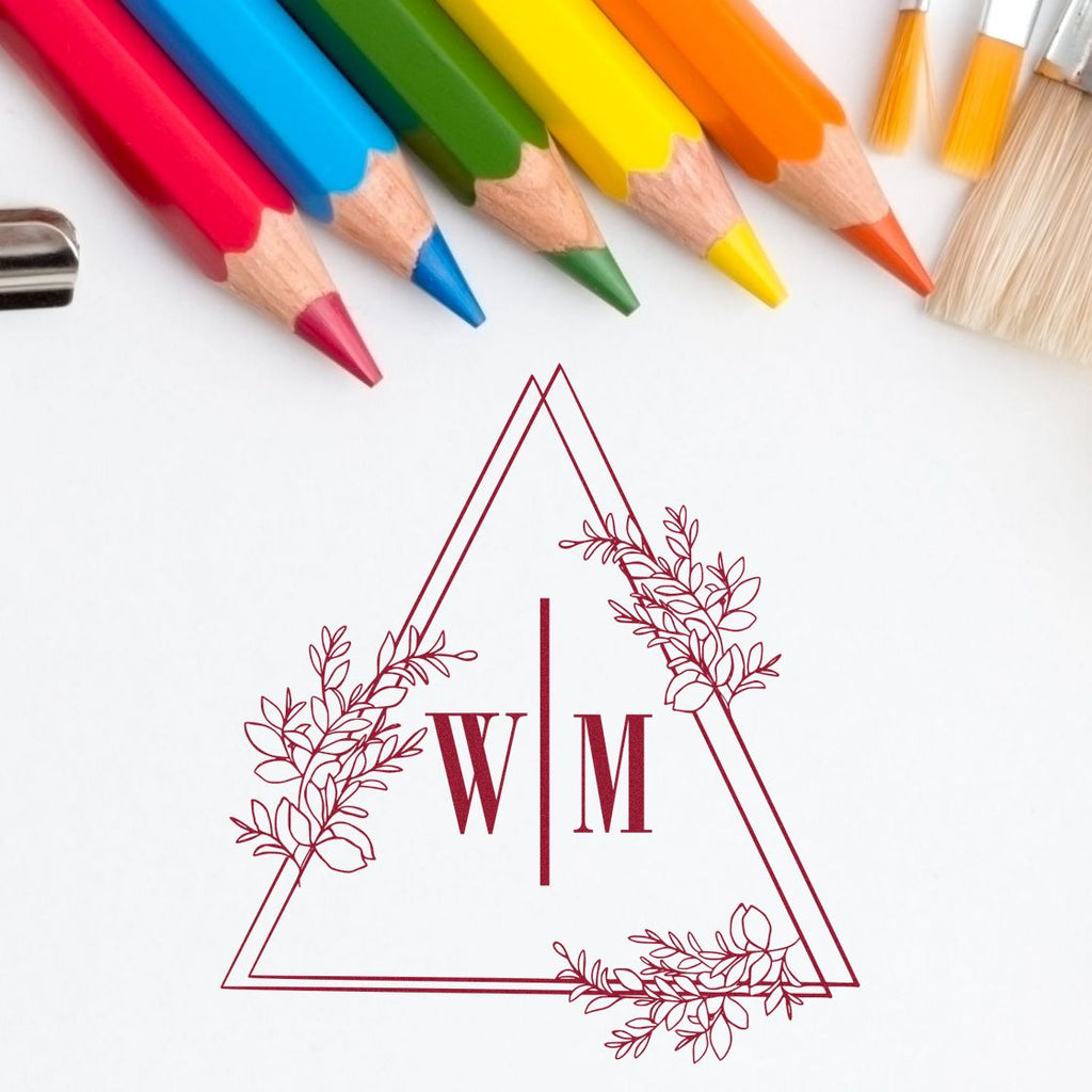 Elevate your wedding stationery with our exquisite Floral Geometric Elegance Custom Couples' Name Stamp - where modern design meets timeless romance. This stunning 1-5/8" square stamp features an innovative geometric pattern with overlapping triangles, perfectly framing your cherished initials.