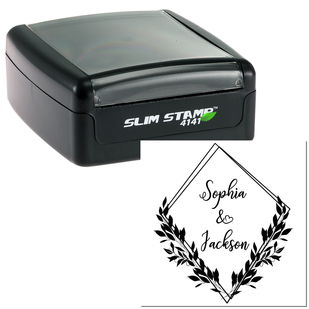 Elevate your personal branding with our exquisite Floral Grace Custom Name Stamp - where elegance meets functionality in perfect harmony. This sophisticated 1-5/8" square stamp transforms ordinary paper into personalized works of art with its stunning diamond-shaped frame and delicate leafy accents.