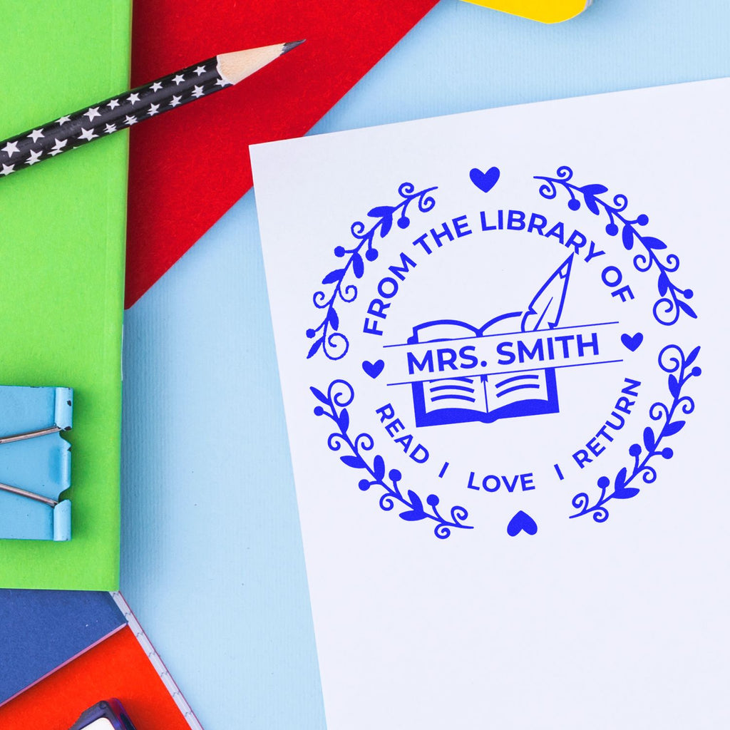 Designed with educators in mind, this personalized stamp features an enchanting open book design adorned with elegant floral elements, creating a professional and inviting impression every time. The thoughtful message "Read it, Love it, Return it" paired with your name adds a personal touch while encouraging responsible book borrowing.