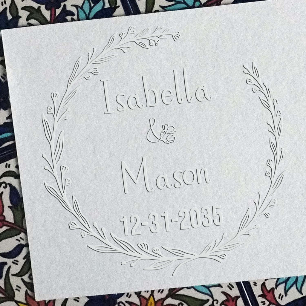 Unleash your creativity and make a lasting impression with the Floral Love Circle Hybrid Custom Initial Rubber Embosser. This exquisite tool is perfect for wedding planners, brides-to-be, or anyone looking to add a personal touch to their stationery. Featuring a chic circular design, this embosser showcases a hand-drawn floral wreath that elegantly wraps around your custom text. With names like "Isabella & Mason" styled in a playful, handwritten font and the date "12-31-2035" in a bold typeface, this embosser is the epitome of charm and romance.