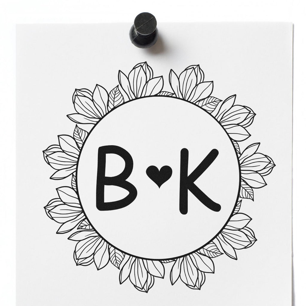 Featuring a stunning design that captures hearts at first sight, this stamp showcases your chosen initials separated by a delicate heart, all embraced by an intricate floral wreath. The perfect blend of bold typography and graceful botanical elements creates an unforgettable mark that's uniquely yours.
