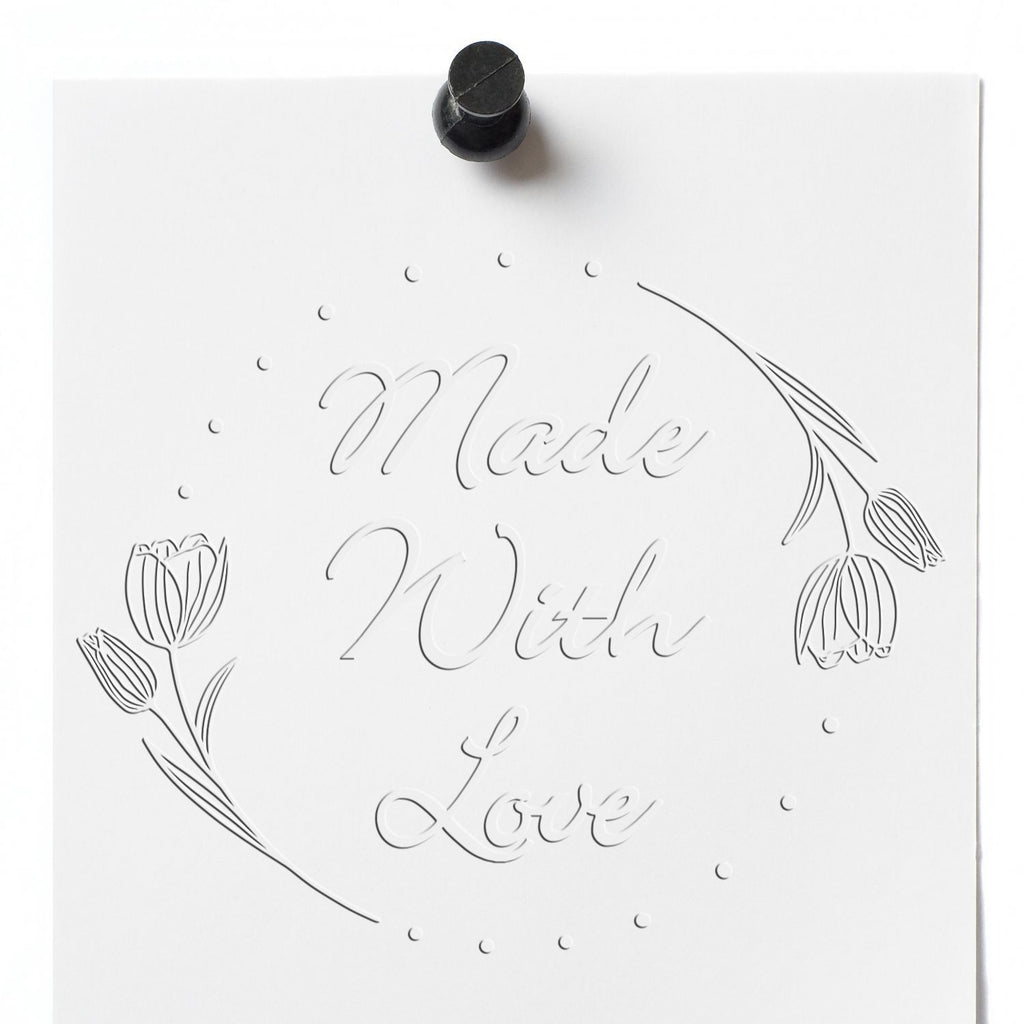 Featuring a charming 1-5/8" round design, this embosser showcases a delicate "made with love" message surrounded by graceful tulips and whimsical dots. The sophisticated layout creates an impression that speaks volumes about your attention to detail and commitment to quality.