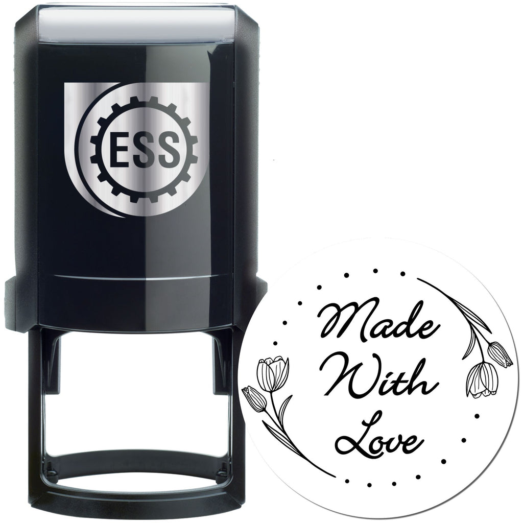 Elevate your wedding preparations with our exquisite 1-5/8" round self-inking stamp, featuring a charming "made with love" message adorned with delicate tulip flowers and whimsical dots. This beautifully crafted stamp brings a touch of romance and sophistication to every impression.